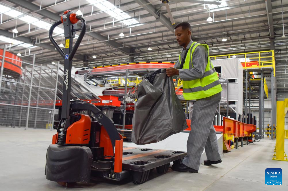 A man works at the e-commerce logistics hub in Addis Ababa, Ethiopia, on Feb. 29, 2024. The Ethiopian Airlines has inaugurated a new e-commerce logistics hub in Addis Ababa, the capital of Ethiopia, to meet the surging demands of online shoppers and retailers. Built by China National Aero-Technology International Engineering Cooperation, the e-commerce logistics hub covers about 15,000 square meters and has a capacity to handle 150,000 tonnes of goods annually. (Xinhua/Michael Tewelde)