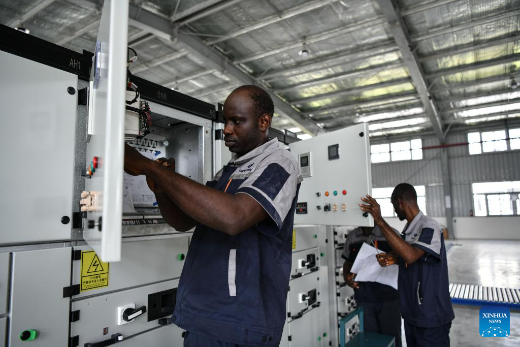 Employees work at a workshop of an electric equipment company in the Lekki Free Trade Zone in Lagos, Nigeria, March 1, 2024. Jointly founded by Chinese companies and the Lagos state government, the Lekki Free Trade Zone started construction in 2006. After 18 years of development, the zone has been gaining momentum in the socio-economic drive of Nigeria, significantly accelerating the process of industrialization and job creation. (Xinhua/Han Xu)