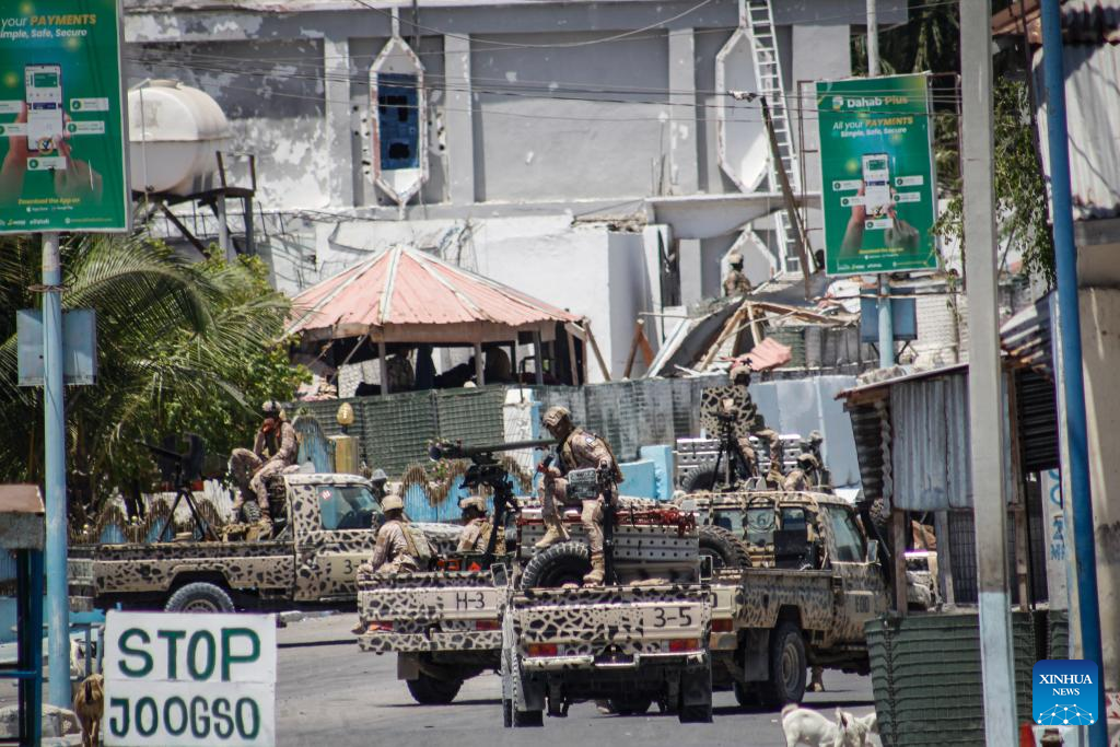 Security forces block a road leading to SYL Hotel in Mogadishu, Somalia, on March 15, 2024. At least three soldiers were killed and 27 others wounded in a terrorist attack at a popular hotel in the Somali capital of Mogadishu Thursday evening, the police confirmed Friday. (Photo by Hassan Bashi/Xinhua)