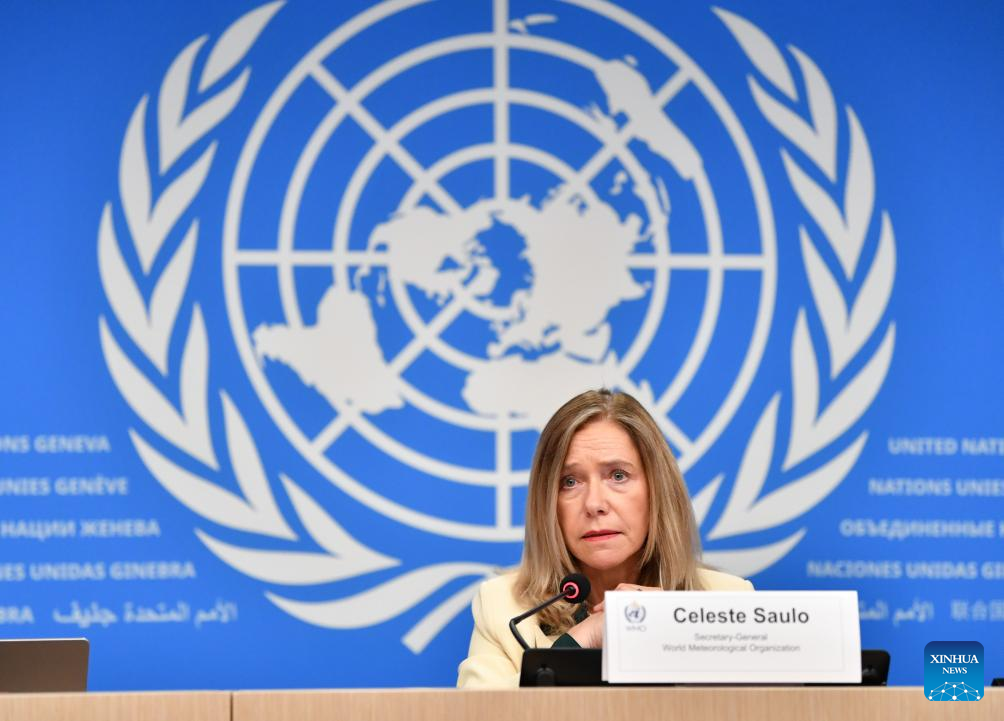 World Meteorological Organization (WMO) Secretary-General Celeste Saulo (C) speaks at a press conference in Geneva, Switzerland, March 19, 2024. The United Nations'(UN) climate chief issued a red alert on Tuesday as new data showed that records for every single climate indicator were shattered in 2023.