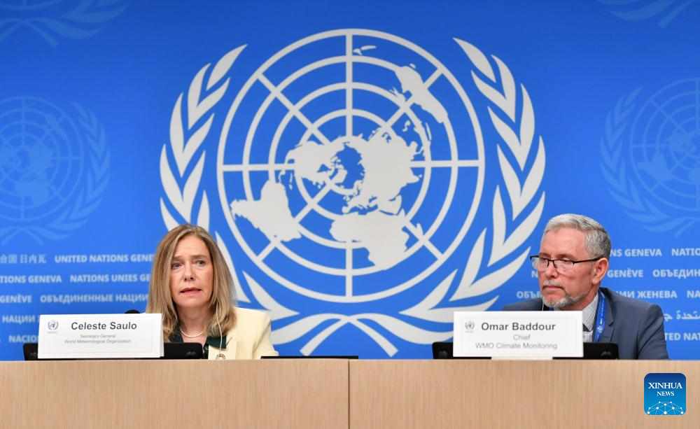 World Meteorological Organization (WMO) Secretary-General Celeste Saulo (L) speaks at a press conference in Geneva, Switzerland, March 19, 2024. The United Nations'(UN) climate chief issued a red alert on Tuesday as new data showed that records for every single climate indicator were shattered in 2023.