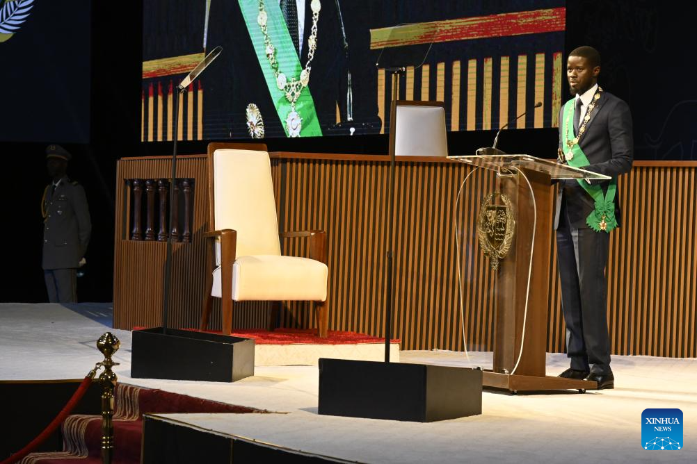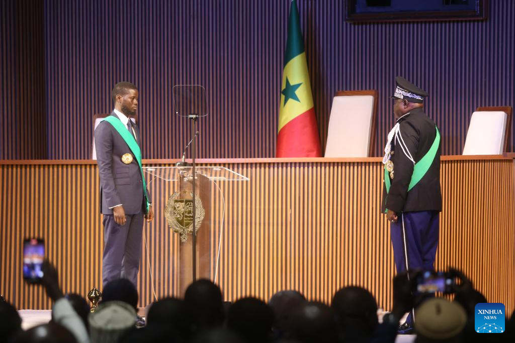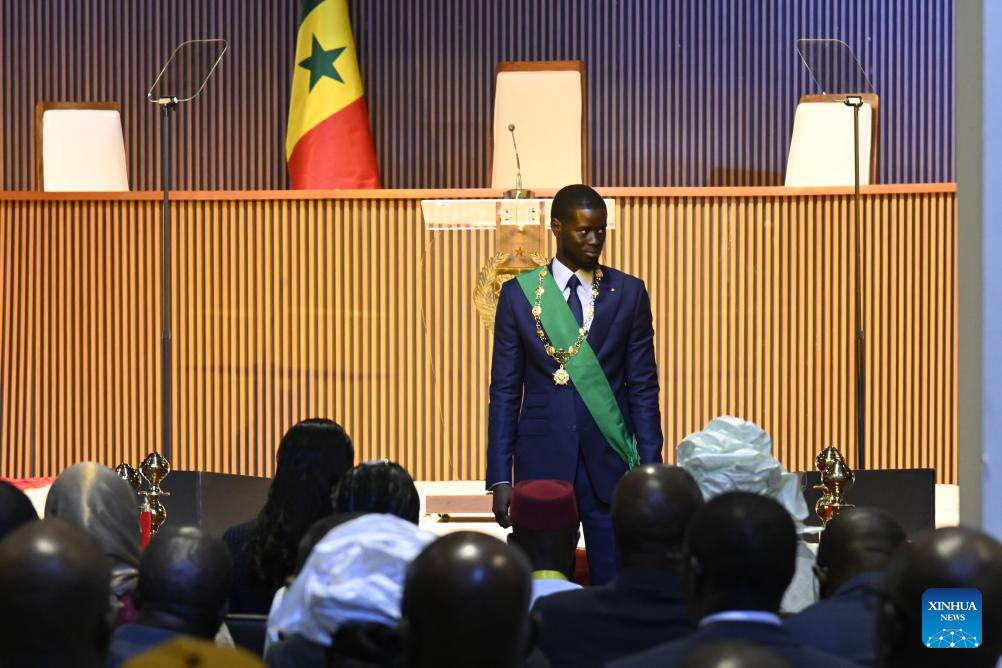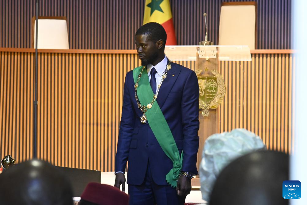 DAKAR, April 2 (Xinhua) -- Bassirou Diomaye Faye, the newly elected president of Senegal, was sworn in Tuesday in Diamniadio, 30 km from Dakar, the capital of Senegal, for a five-year term.