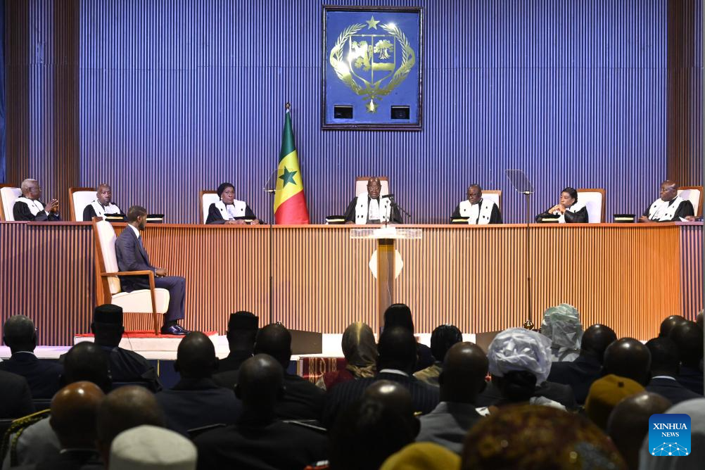Bassirou Diomaye Faye (C) is sworn in as Senegalese president in Diamniadio, Senegal, on April 2, 2024. Bassirou Diomaye Faye, the newly elected president of Senegal, was sworn in Tuesday in Diamniadio, 30 km from Dakar, the capital of Senegal, for a five-year term. (Photo by Demba Gueye/Xinhua)