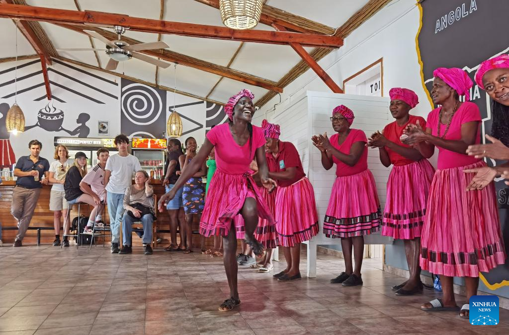 Women dance for visitors in the Goreangab township, Windhoek, Namibia, on April 4, 2024. In the Goreangab township northwest of Namibia's capital, Windhoek, Victoria Ndilimeke applied wax and dye to the fabric at a workshop, creating colorful patterns. This batik work is part of a sought-after art collection produced by over 20 women at Penduka Trust, which is a women-empowering initiative to utilize art as a catalyst to help locals secure a better life. (Photo by Ndalimpinga Iita/Xinhua)
