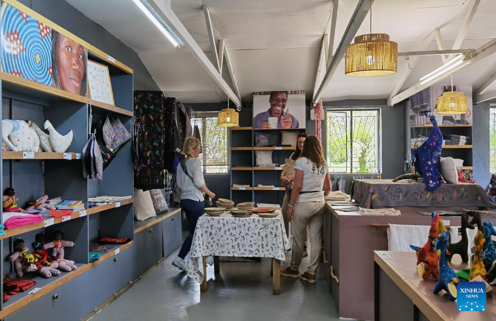 People visit the art workshop in the Goreangab township, Windhoek, Namibia, on April 4, 2024. In the Goreangab township northwest of Namibia's capital, Windhoek, Victoria Ndilimeke applied wax and dye to the fabric at a workshop, creating colorful patterns. This batik work is part of a sought-after art collection produced by over 20 women at Penduka Trust, which is a women-empowering initiative to utilize art as a catalyst to help locals secure a better life. (Photo by Ndalimpinga Iita/Xinhua)