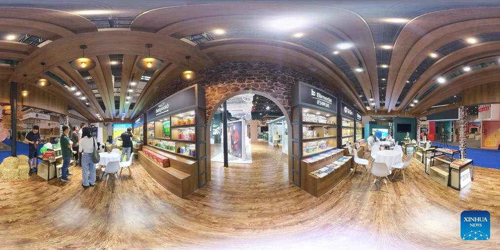 This photo taken by a panoramic camera shows the exhibition area of Ireland, the guest of honor, at the Hainan International Convention and Exhibition Center, the main venue for the upcoming fourth China International Consumer Products Expo, in Haikou, south China's Hainan Province, April 12, 2024. The fourth China International Consumer Products Expo will open on Saturday in Haikou, the capital city of south China's Hainan Province.