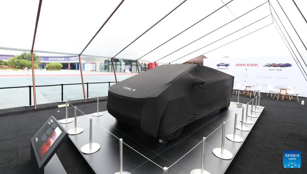 An exhibition area of Tesla is pictured at the Hainan International Convention and Exhibition Center, the main venue for the upcoming fourth China International Consumer Products Expo, in Haikou, south China's Hainan Province, April 12, 2024. The fourth China International Consumer Products Expo will open on Saturday in Haikou, the capital city of south China's Hainan Province.