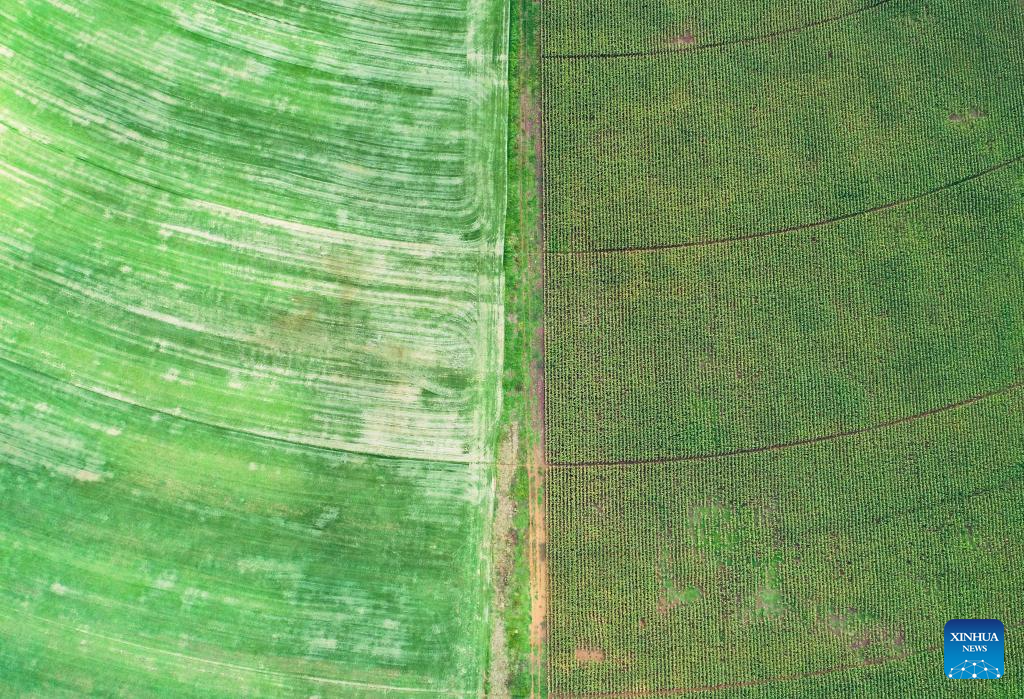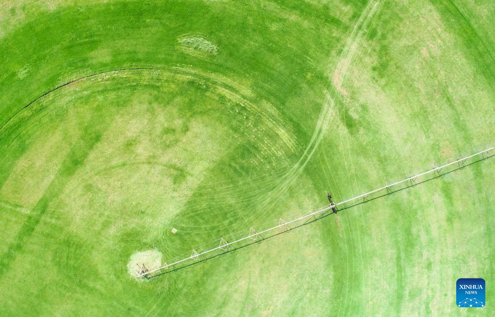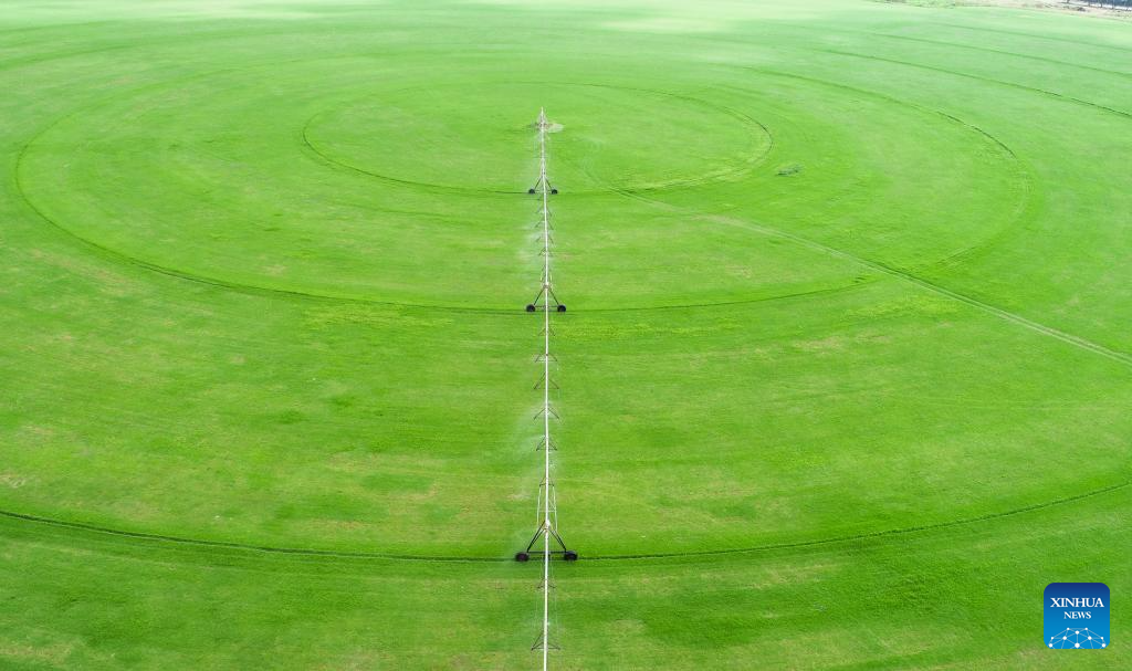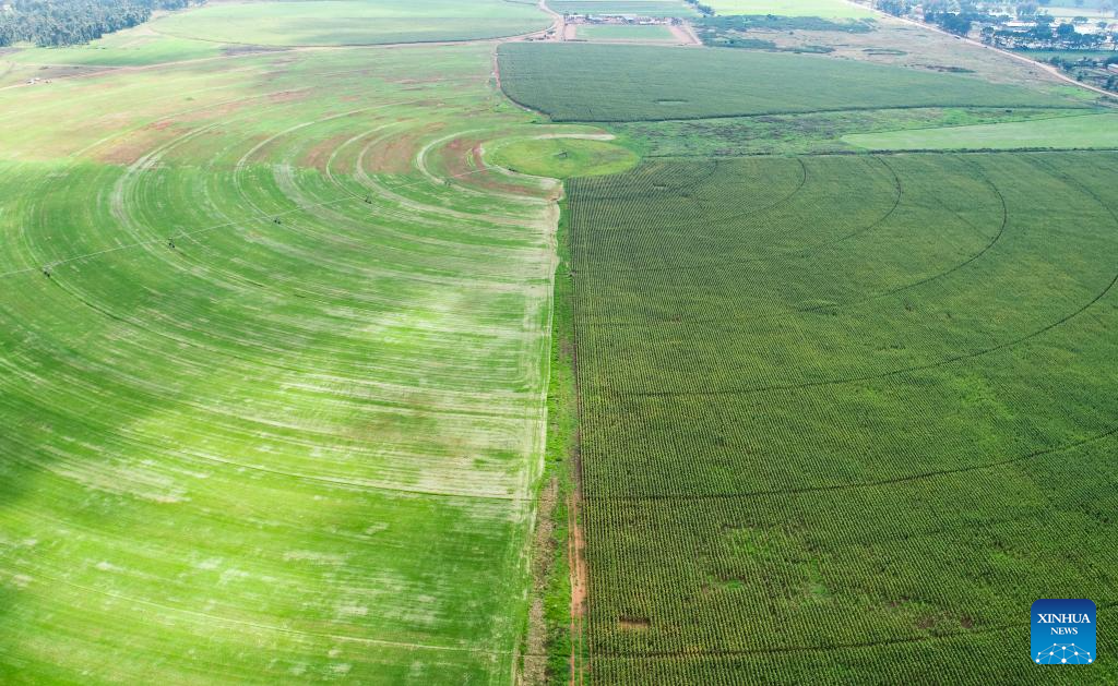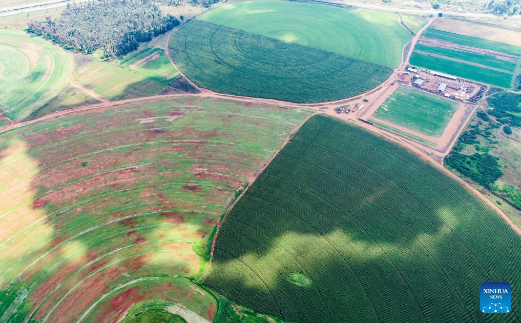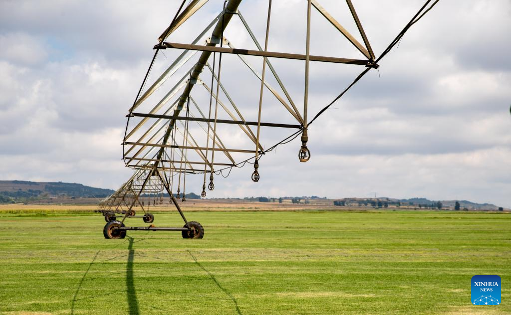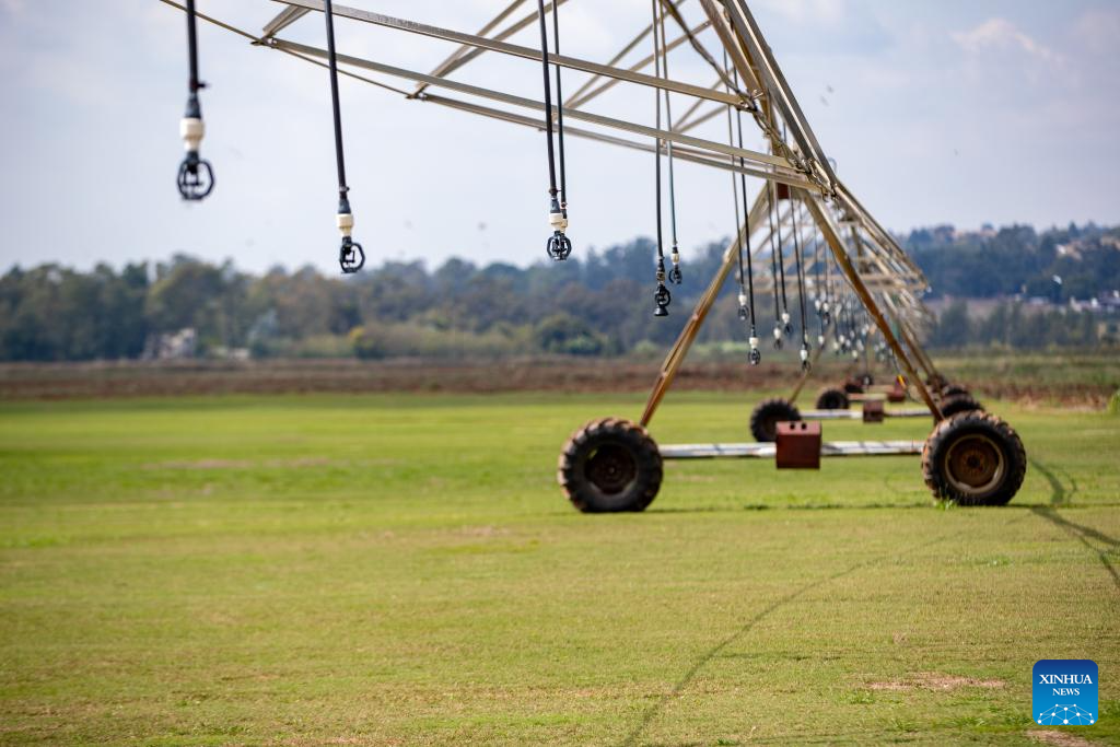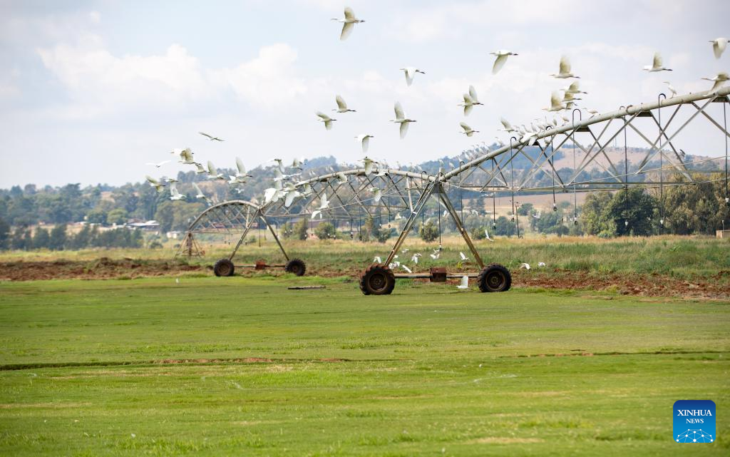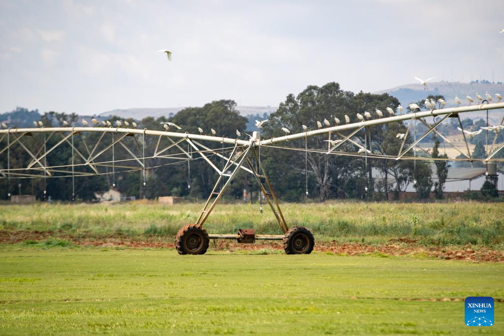This photo taken on April 12, 2024 shows the center-pivot irrigation equipment on a circular field in the suburb of Johannesburg, South Africa. (Xinhua/Zhang Yudong)