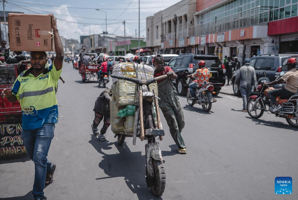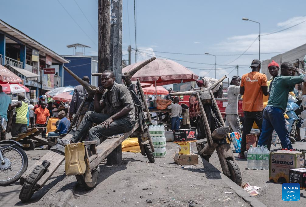 A dealer transports cargo with Chukudu in a market in Goma, Democratic Republic of the Congo (DRC), April 12, 2024. In the east of the Democratic Republic of Congo, a local wooden scooter called the Chukudu, originating back in the 1970s, has become essential for people to carry heavy stuff and make their earnings. (Xinhua/Wang Guansen)