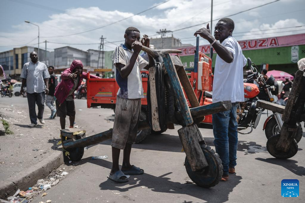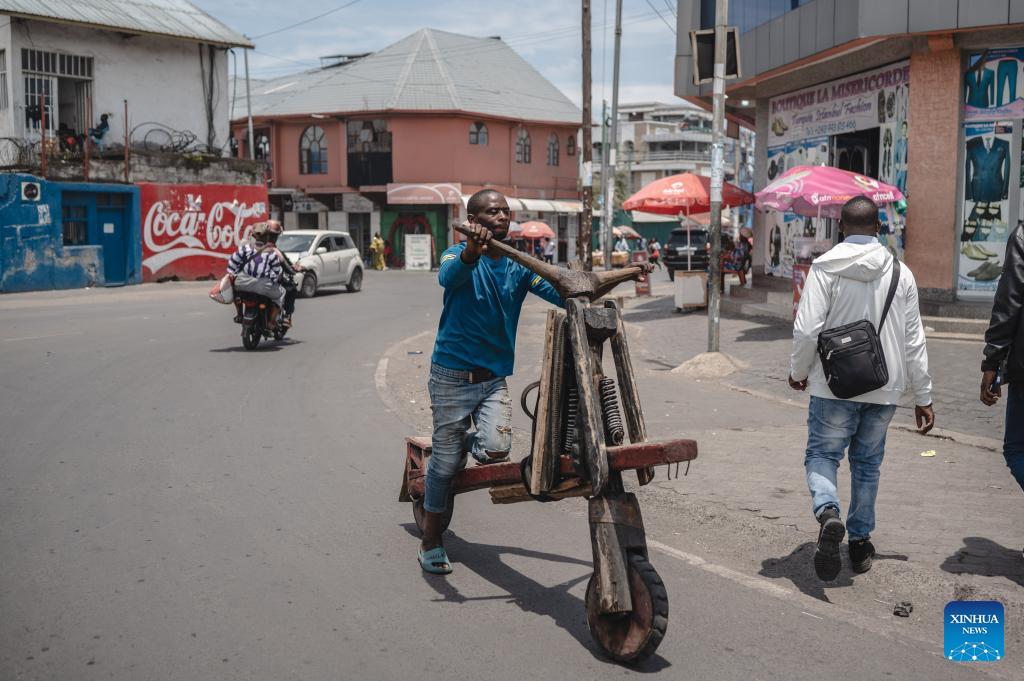 A man rides a Chukudu on the street in Goma, Democratic Republic of the Congo (DRC), April 12, 2024. In the east of the Democratic Republic of Congo, a local wooden scooter called the Chukudu, originating back in the 1970s, has become essential for people to carry heavy stuff and make their earnings. (Xinhua/Wang Guansen)