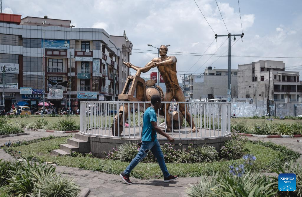 A man walks past a Chukudu statue located in Goma, Democratic Republic of the Congo (DRC), April 12, 2024. In the east of the Democratic Republic of Congo, a local wooden scooter called the Chukudu, originating back in the 1970s, has become essential for people to carry heavy stuff and make their earnings. (Xinhua/Wang Guansen)