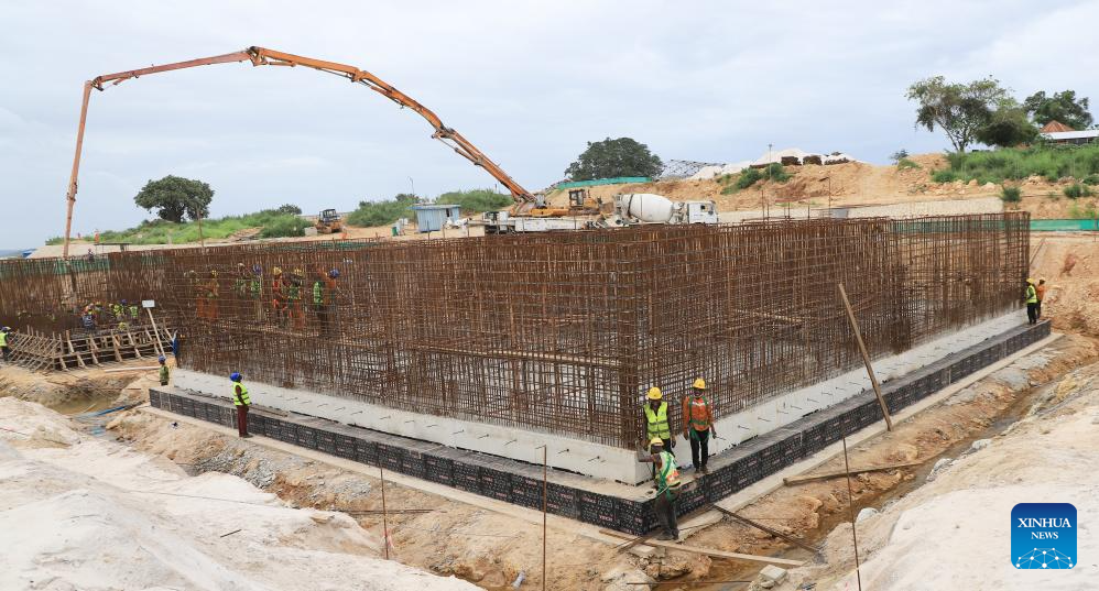 This photo taken on April 16, 2024 shows workers operating at the construction site of Tanzania's first-ever fishing harbor in Kilwa Masoko in Lindi, Tanzania. The construction of the harbor in Kilwa Masoko on the Indian Ocean coastline in the Lindi region has reached 42 percent.