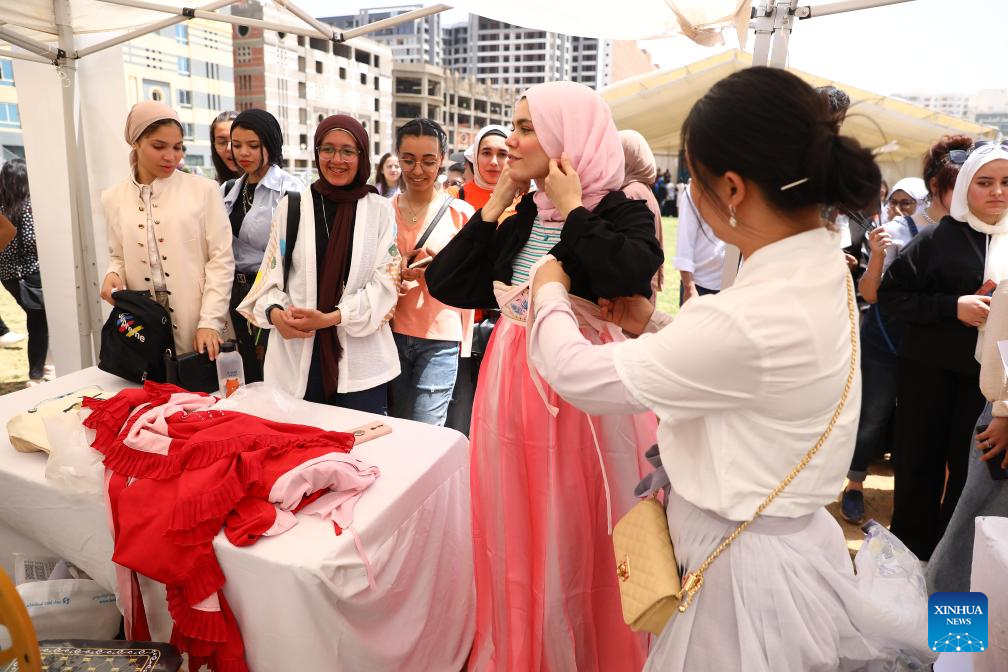 An Egyptian student tries traditional Chinese costumes during a ceremony to celebrate Chinese Language Day in Cairo, Egypt, April 27, 2024. Students studying in Egyptian colleges celebrated Saturday the United Nations Chinese Language Day with a themed event featuring a concert, food and tea tasting, sketch comedy, and art show. (Xinhua/Ahmed Gomaa)