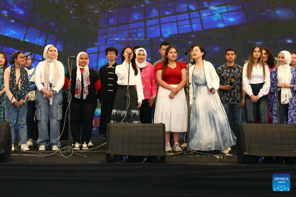 Students and teachers perform a song during a ceremony to celebrate Chinese Language Day in Cairo, Egypt, April 27, 2024. Students studying in Egyptian colleges celebrated Saturday the United Nations Chinese Language Day with a themed event featuring a concert, food and tea tasting, sketch comedy, and art show. (Xinhua/Ahmed Gomaa)