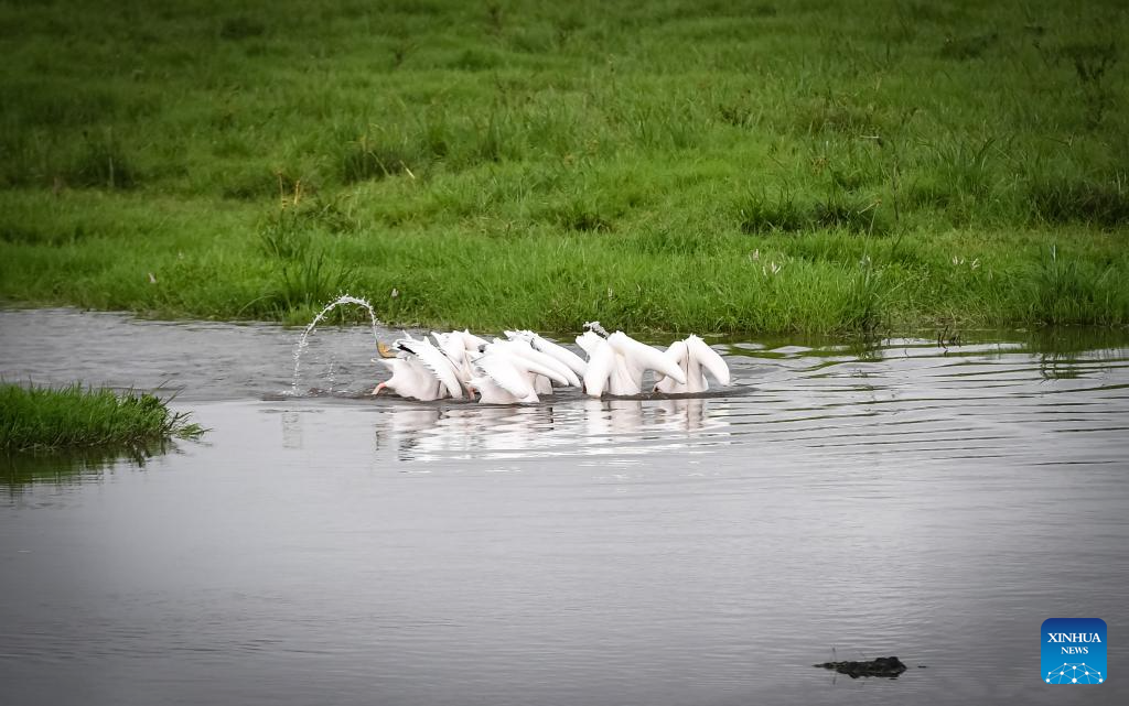 Pelicans forage at Amboseli National Park in Kajiado County, Kenya, on April 28, 2024.