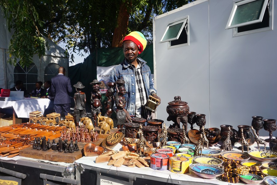 This photo taken on July 1, 2023, shows a craft trader showcasing his artworks at the Zambia International Trade Fair in Ndola, Zambia. (Photo by Lillian Banda/Xinhua)