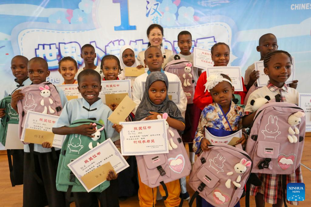 Tanzanian pupils receive awards after a "Chinese Bridge" contest in Dar es Salaam, Tanzania on May 8, 2024. (Xinhua/Emmanuel Herman)