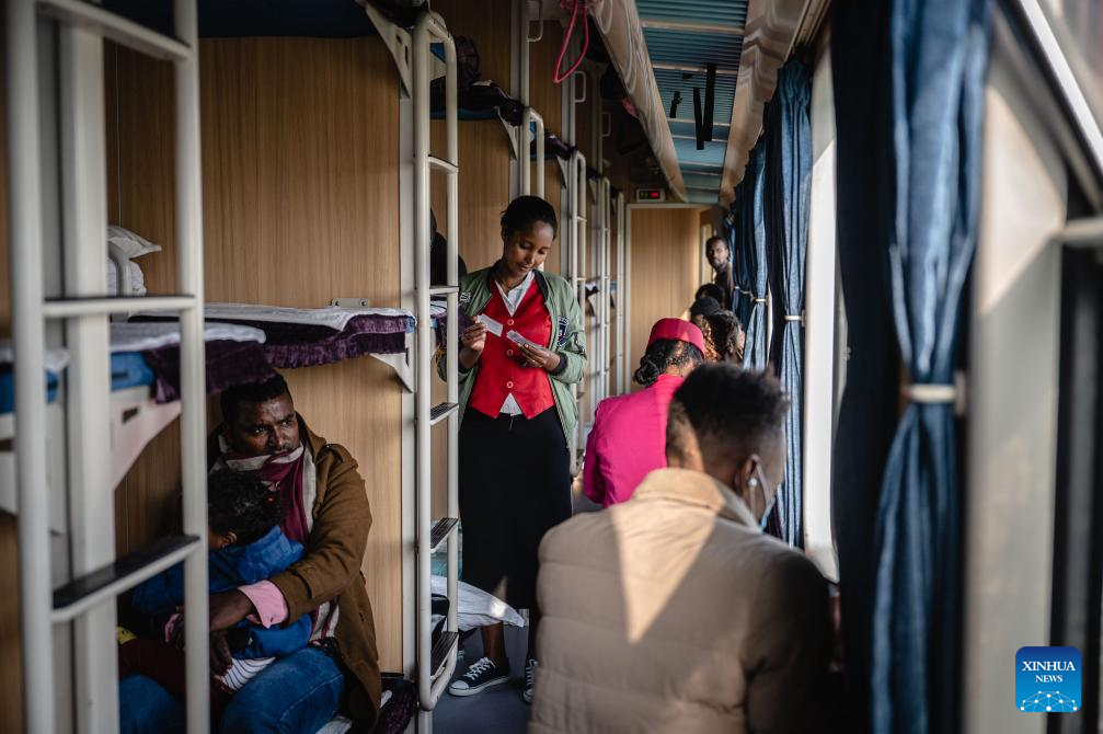 A train attendant checks passengers' tickets in the cabin in Ethiopia, Sept. 9, 2023. The Chinese management contractors of Ethiopia-Djibouti standard gauge railway on Friday officially handed over the railway's management and operation to Ethiopia and Djibouti after six years of successful operation. (Xinhua/Wang Guansen)