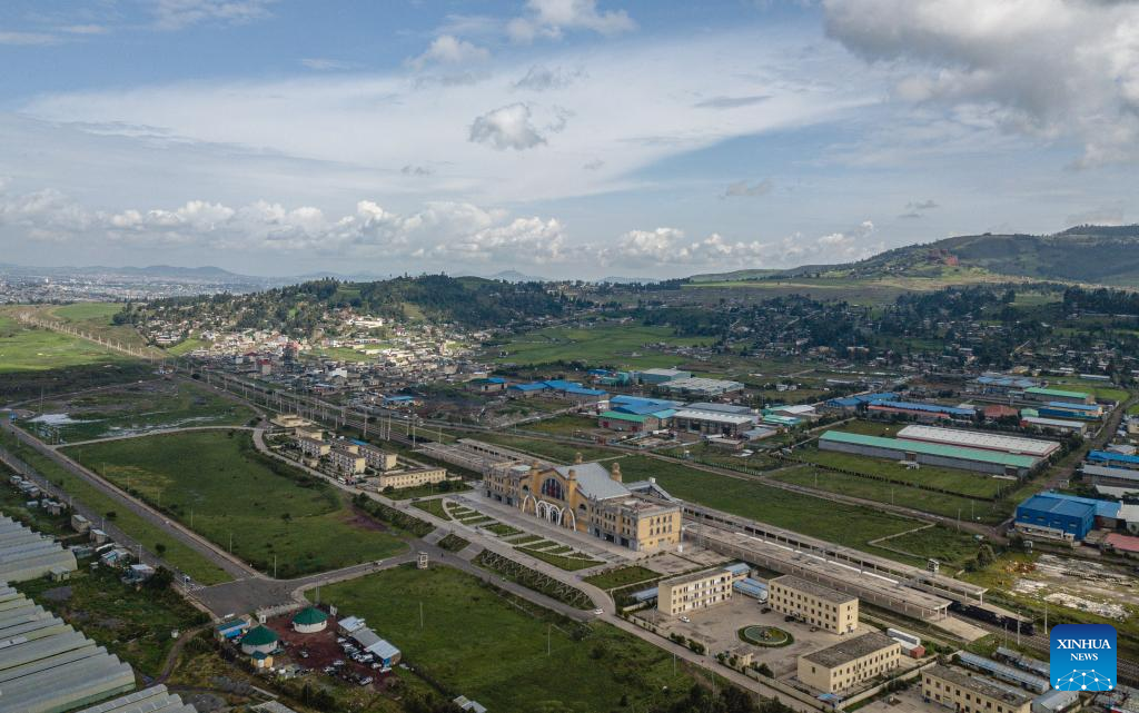 This aerial drone photo taken on Sept. 11, 2023 shows the Lebu Railway Station in Addis Ababa, Ethiopia. The Chinese management contractors of Ethiopia-Djibouti standard gauge railway on Friday officially handed over the railway's management and operation to Ethiopia and Djibouti after six years of successful operation. (Xinhua/Wang Guansen)