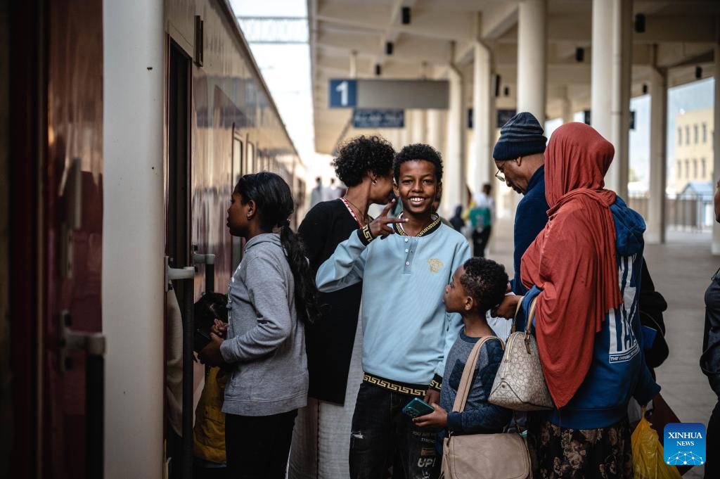 Passengers board a train at the Lebu Railway Station in Addis Ababa, Ethiopia, Sept. 9, 2023. The Chinese management contractors of Ethiopia-Djibouti standard gauge railway on Friday officially handed over the railway's management and operation to Ethiopia and Djibouti after six years of successful operation. (Xinhua/Wang Guansen)
