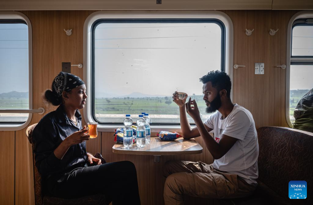 Passengers chat in the dining cabin of a train in Ethiopia on Sept. 9, 2023. The Chinese management contractors of Ethiopia-Djibouti standard gauge railway on Friday officially handed over the railway's management and operation to Ethiopia and Djibouti after six years of successful operation. (Xinhua/Wang Guansen)