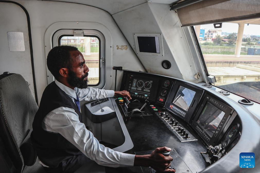 This photo taken on May 10, 2024 show an Ethiopian locomotive driver, trained by the Chinese counterpart, controls the train in the cab in Ethiopia. The Chinese management contractors of Ethiopia-Djibouti standard gauge railway on Friday officially handed over the railway's management and operation to Ethiopia and Djibouti after six years of successful operation. (Xinhua/Liu Fangqiang)
