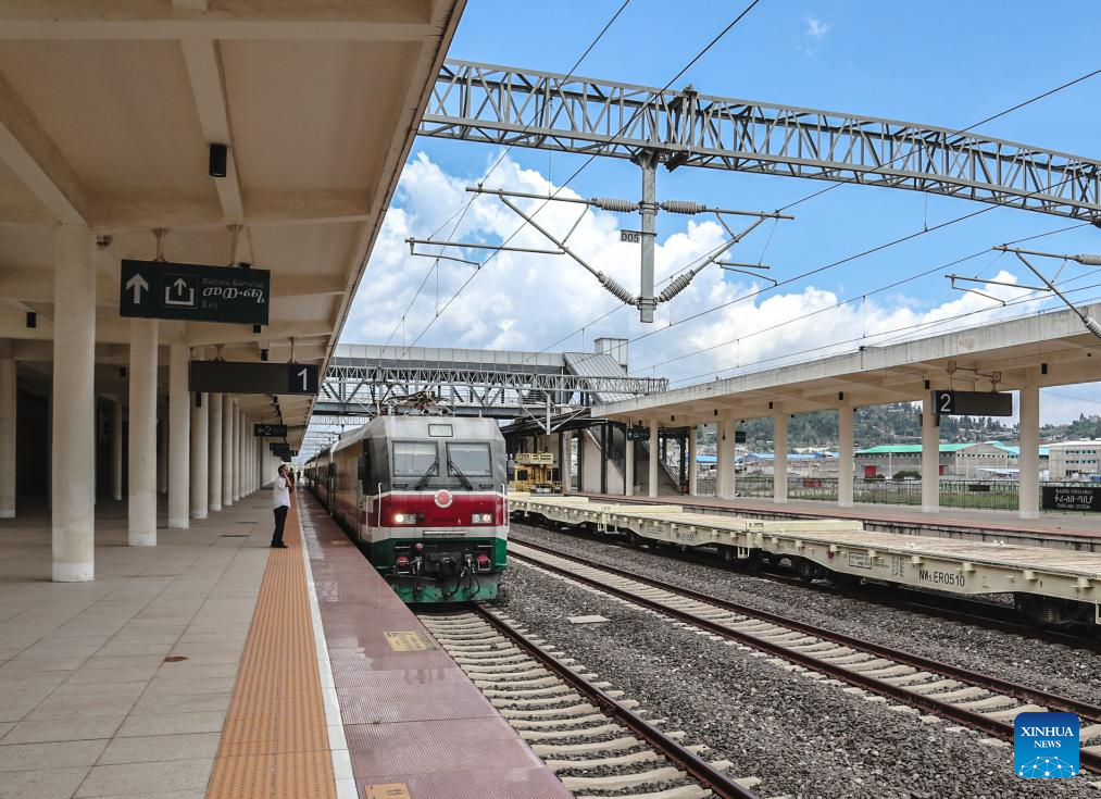 This photo taken on May 10, 2024 shows a train drives into the Lebu Railway Station in Addis Ababa, Ethiopia. The Chinese management contractors of Ethiopia-Djibouti standard gauge railway on Friday officially handed over the railway's management and operation to Ethiopia and Djibouti after six years of successful operation. (Xinhua/Liu Fangqiang)