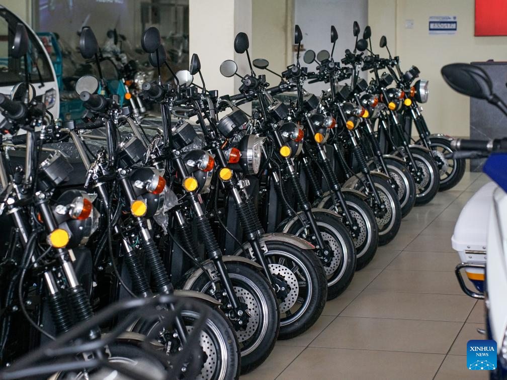 This photo taken on May 2, 2024 shows electric vehicles displayed at Hanlin Africa New Energy Technology Company Limited in Nairobi, Kenya. (Xinhua/Li Yahui)