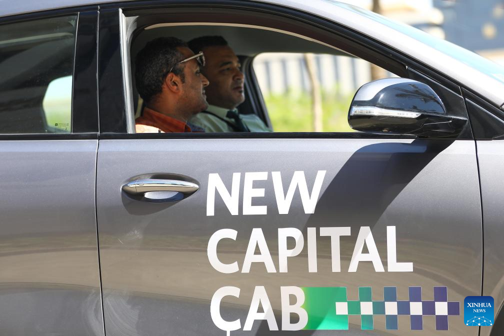 Photo taken on May 15, 2024 shows an electric taxi during a pilot program ceremony in New Administrative Capital, Egypt. Egypt kicked off the pilot program on Wednesday for operating the country's first fleet of electric taxis in its newly-built New Administrative Capital (NAC), aiming to provide eco-friendly and smart transportation options. (Xinhua/Ahmed Gomaa)