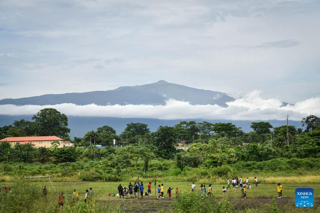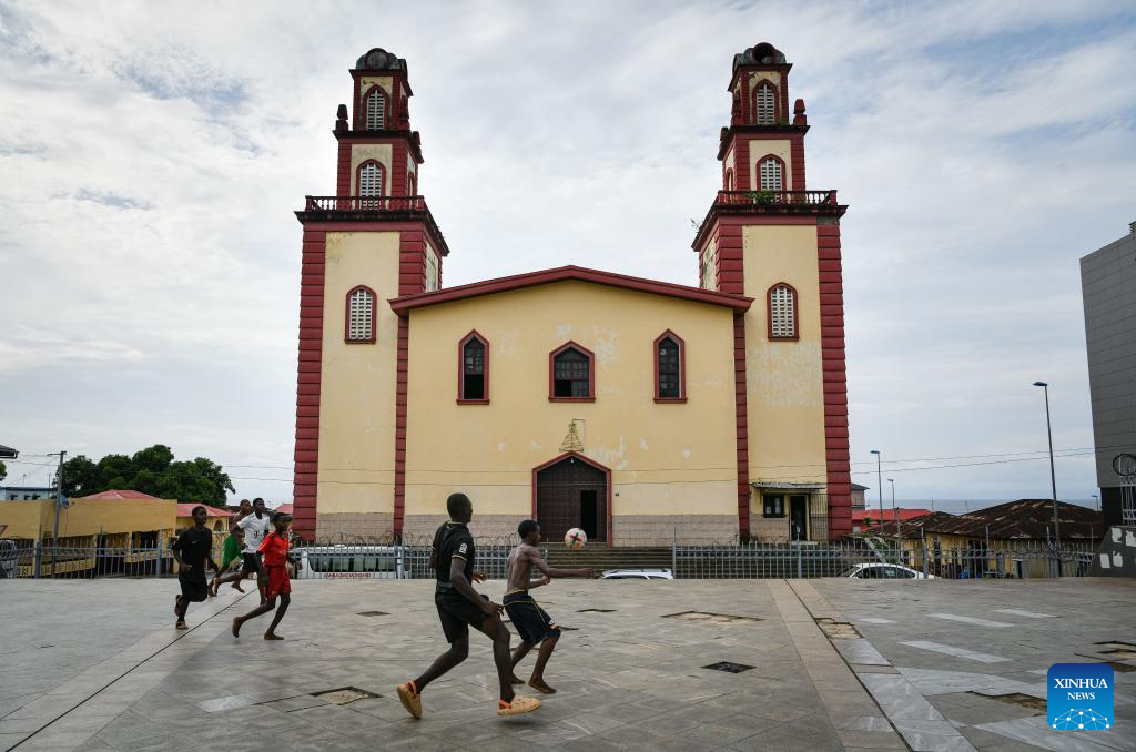 People play football at San Fernando Square in Malabo, Equatorial Guinea on May 20, 2024. Malabo is situated in the northern part of Bioko Island. The city serves as the political, commercial, financial, and cultural hub of Equatorial Guinea. It is also a major aviation hub and an important seaport of the country. (Xinhua/Han Xu)