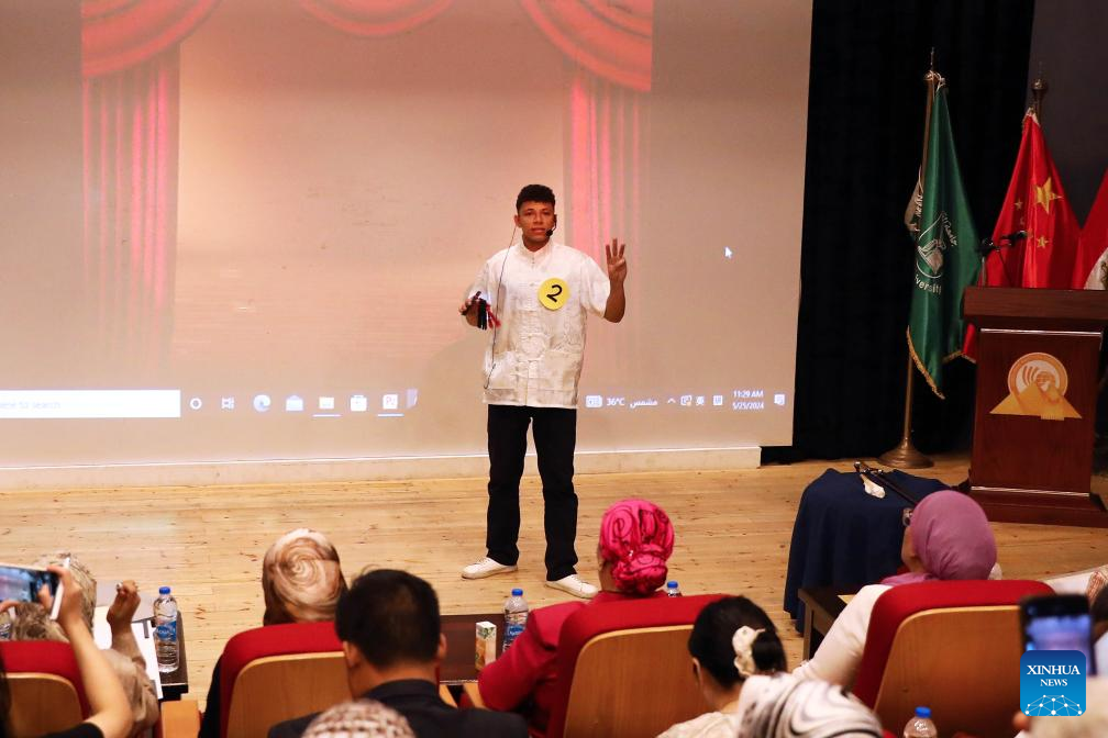 A student performs during the "Chinese Bridge" contest in Chinese language proficiency at the theater of Confucius Institute for Chinese learning at Cairo University in Cairo, Egypt, on May 25, 2024. (Xinhua/Ahmed Gomaa)