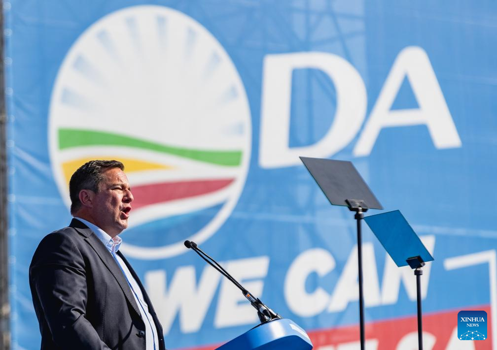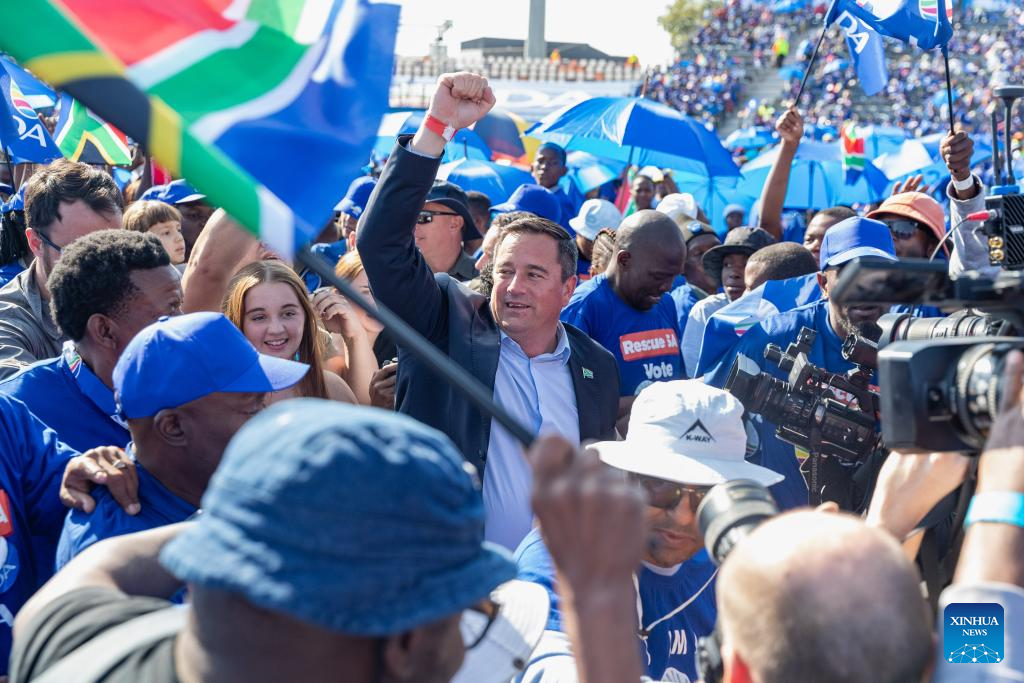 Leader of South Africa's main opposition party Democratic Alliance (DA) John Steenhuisen (C) speaks during an election rally in Benoni of Gauteng, South Africa, May 26, 2024. South Africa is scheduled to hold national and local government elections on May 29. (Xinhua/Zhang Yudong)