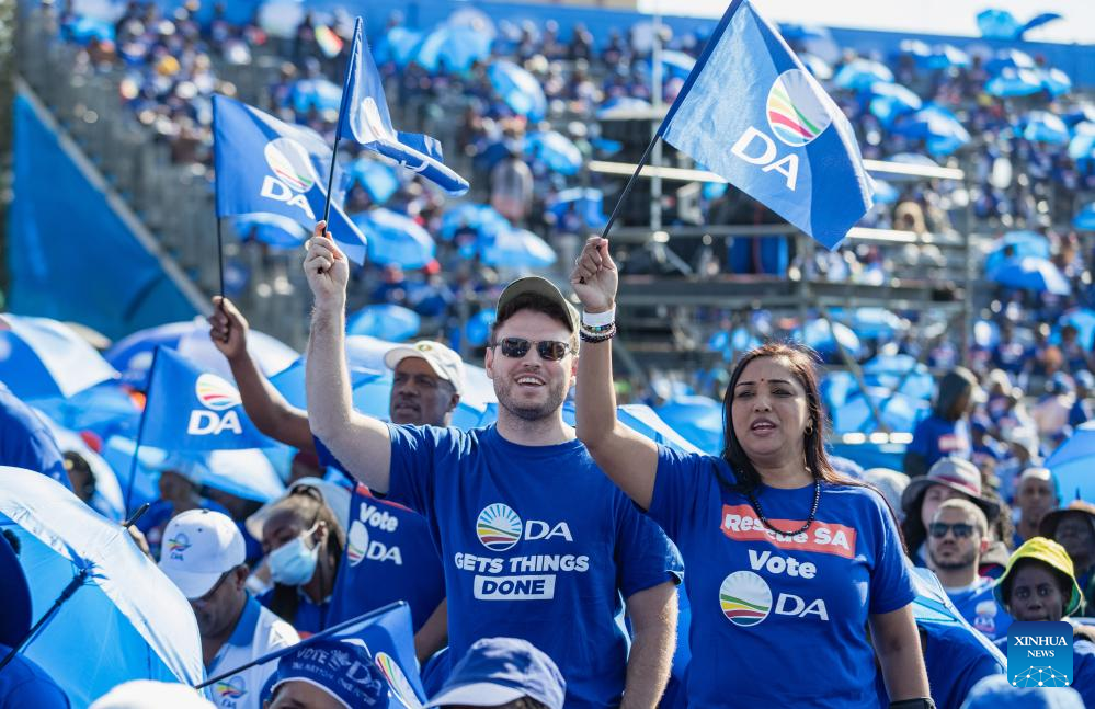 Supporters of the South Africa's main opposition party Democratic Alliance (DA) wave flags during an election rally in Benoni of Gauteng, South Africa, May 26, 2024. South Africa is scheduled to hold national and local government elections on May 29. (Xinhua/Zhang Yudong)