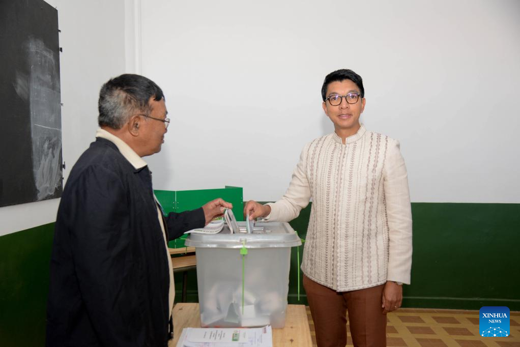 Malagasy President Andry Rajoelina (R) casts his vote at a polling station in Antananarivo, Madagascar, on May 29, 2024. The parliamentary election in Madagascar took place on Wednesday, with citizens voting to elect 163 deputies to the National Assembly. (Xinhua/Sitraka Rajaonarison)
