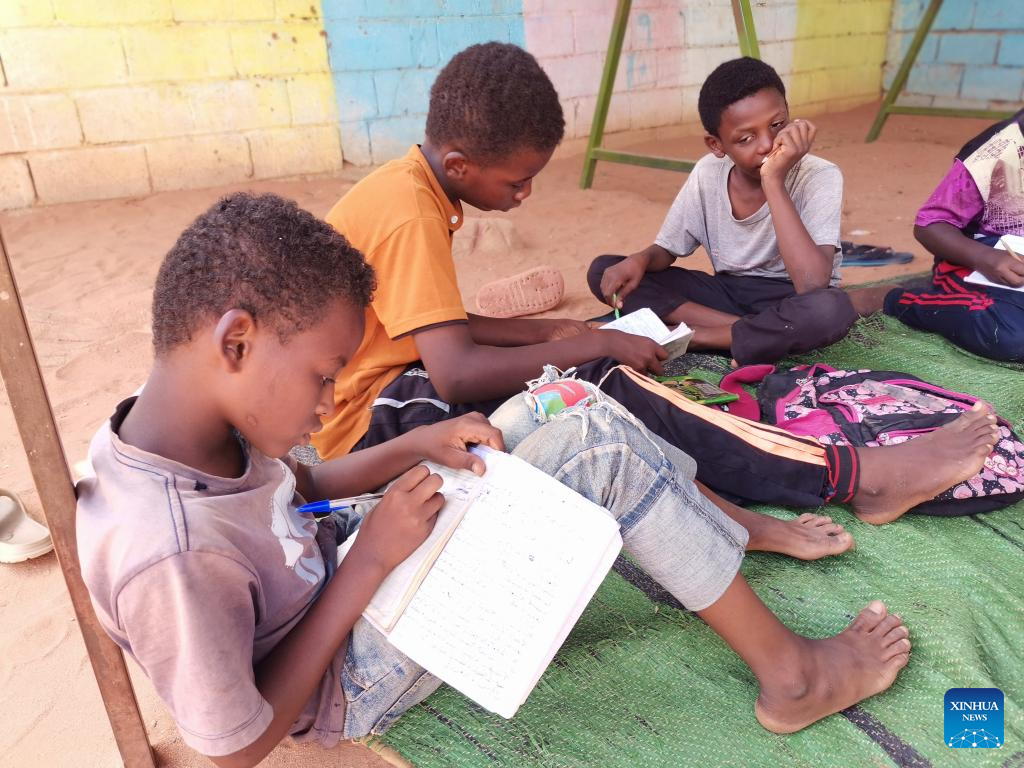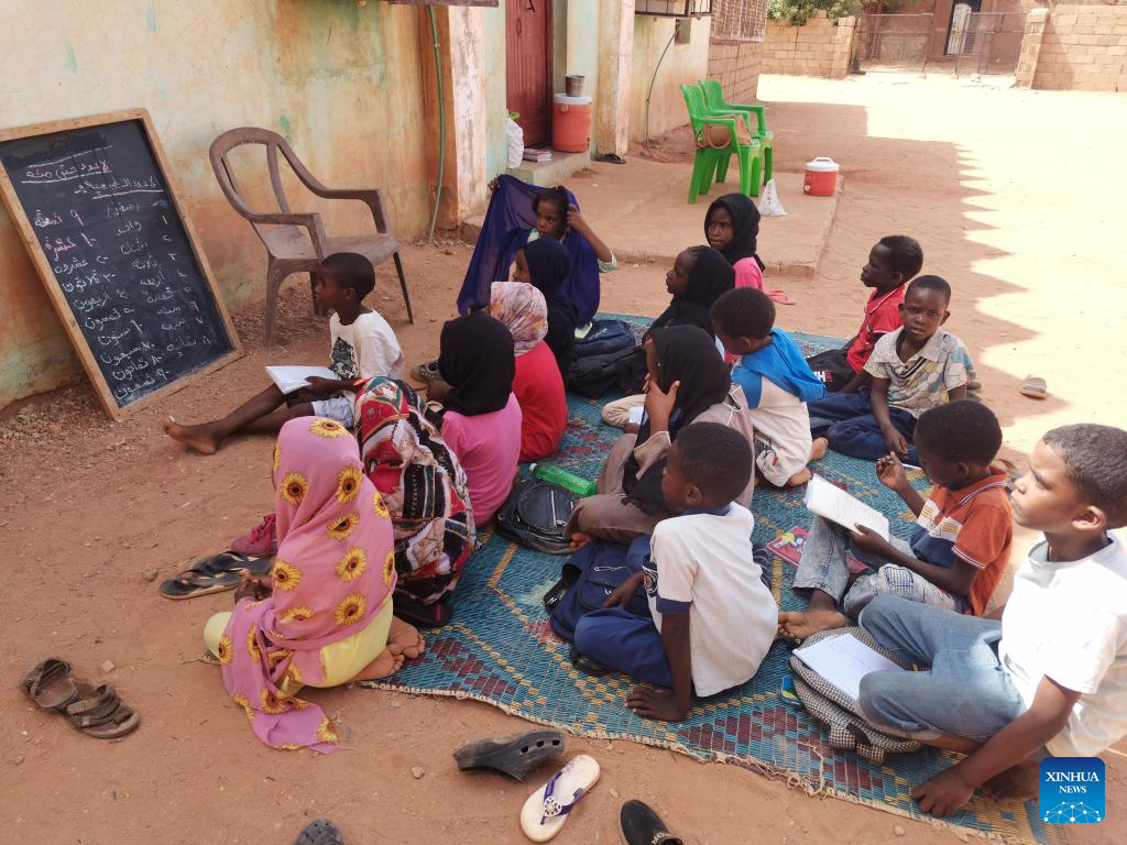 This photo taken with a mobile phone shows Sudanese students having a class at a mosque yard in Omdurman city, Sudan, June 2, 2024. The ongoing conflict between the Sudanese Armed Forces (SAF) and the paramilitary Rapid Support Forces (RSF) has exposed the Sudanese children to various forms of violence and deprived them of homes and education, causing trauma for the generation.
