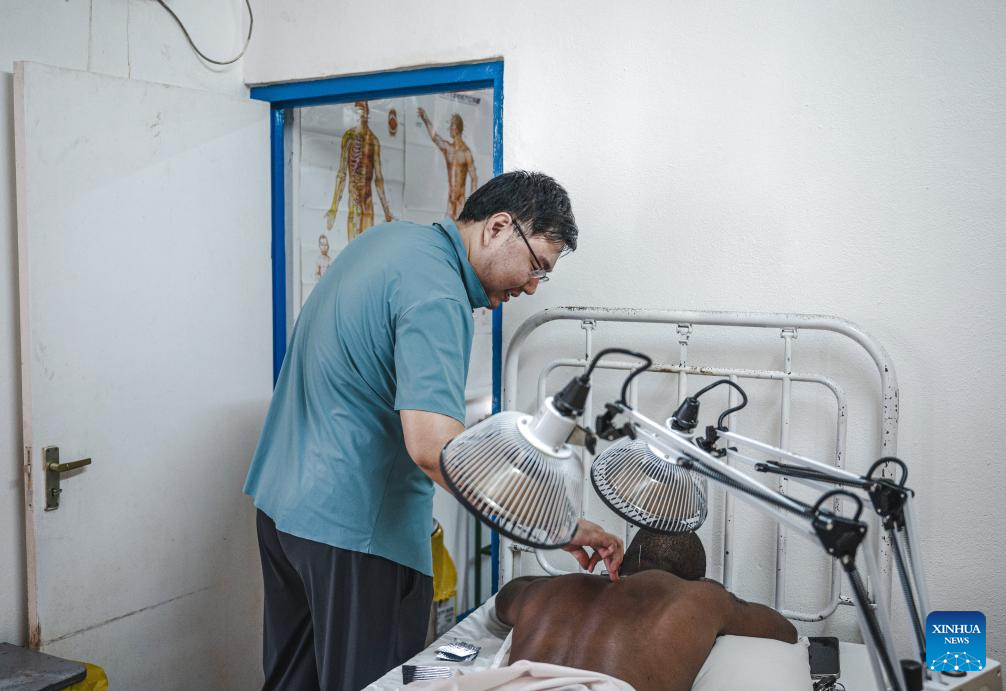 Chinese medical team member Wang Tianda provides acupuncture treatment at a rehabilitation center in Mahe island, Seychelles, June 7, 2024. The 19th Chinese medical team dispatched to Seychelles has been providing medical services to the public since their arrival in May of last year. (Xinhua/Wang Guansen)