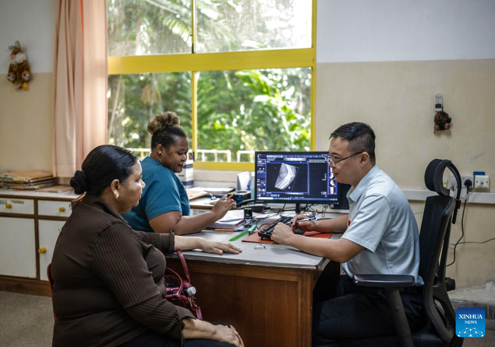 Chinese medical team member Song Fei communicates with a patient at Victoria Hospital, in Victoria, Seychelles, June 5, 2024. The 19th Chinese medical team dispatched to Seychelles has been providing medical services to the public since their arrival in May of last year. (Xinhua/Wang Guansen)