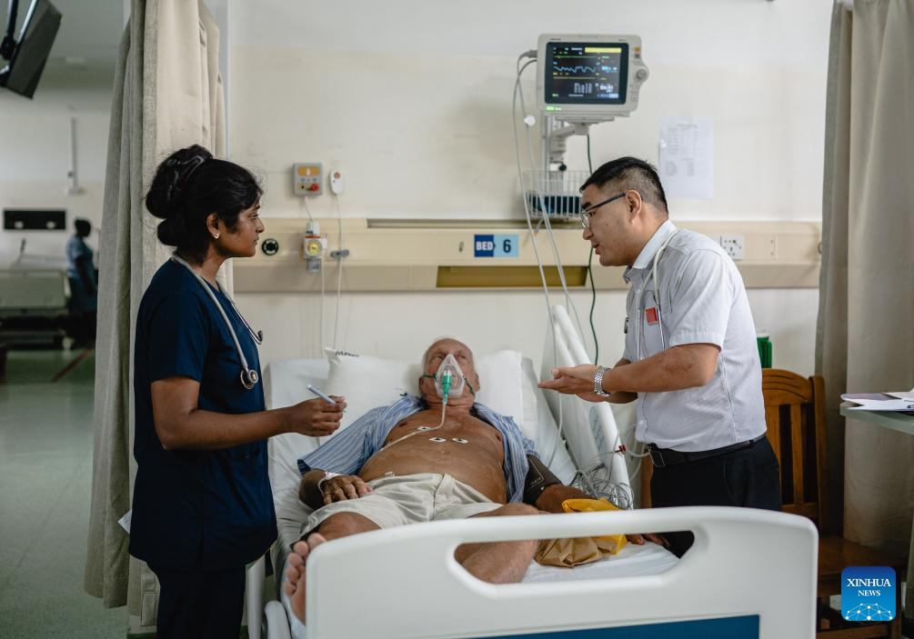 Chinese medical team member Zhang Jiuchao communicates with a patient at Victoria Hospital, in Victoria, Seychelles, June 5, 2024. The 19th Chinese medical team dispatched to Seychelles has been providing medical services to the public since their arrival in May of last year. (Xinhua/Wang Guansen)