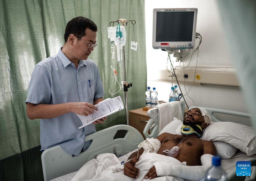 Zhuo Xiaoqing (R), captain of the 19th Chinese medical team dispatched to Seychelles, discusses the condition of a patient with a nurse at Victoria Hospital, in Victoria, Seychelles, June 5, 2024. The 19th Chinese medical team dispatched to Seychelles has been providing medical services to the public since their arrival in May of last year. (Xinhua/Wang Guansen)