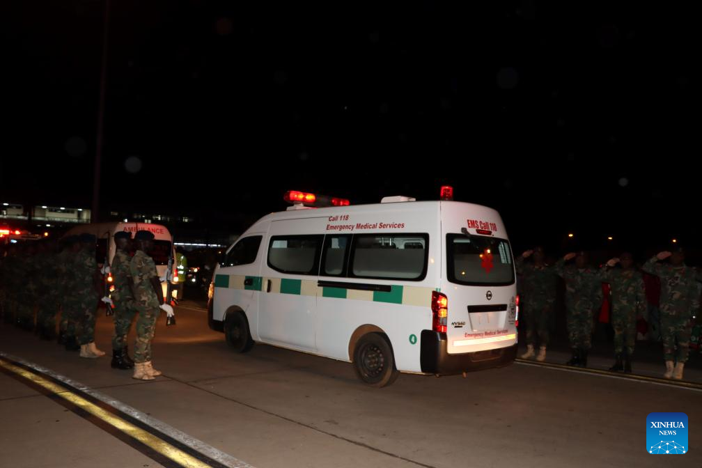 An ambulance carrying the remains of Malawian Vice President Saulos Chilima is seen at Kamuzu International Airport in Lilongwe, Malawi, June 11, 2024. Malawi has announced a 21-day mourning period for Vice President Saulos Chilima, who died in a plane crash Monday along with eight others onboard the aircraft. (Photo by Roy Nkosi/Xinhua)