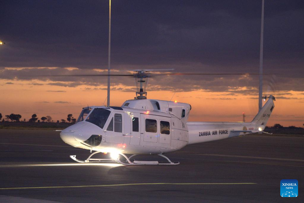 The helicopter carrying the remains of Malawian Vice President Saulos Chilima and other victims arrives at Kamuzu International Airport in Lilongwe, Malawi, June 11, 2024. Malawi has announced a 21-day mourning period for Vice President Saulos Chilima, who died in a plane crash Monday along with eight others onboard the aircraft. (Photo by Roy Nkosi/Xinhua)