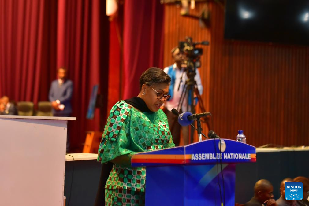 Judith Suminwa Tuluka speaks at the swearing-in ceremony in Kinshasa, the Democratic Republic of the Congo (DRC), June 11, 2024. Judith Suminwa Tuluka was sworn in early Wednesday as the first female prime minister of the DRC, with an "ambitious and detailed" action plan that will cost 92.9 billion U.S. dollars over the next five years. (Str/Xinhua)