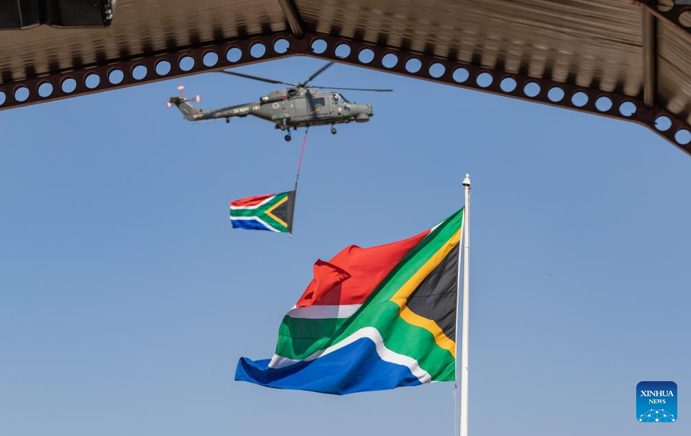 A helicopter flies over the swearing-in ceremony of South African President Cyril Ramaphosa in Pretoria, South Africa, June 19, 2024. Ramaphosa, 71, leader of South Africa's ruling African National Congress (ANC), was reelected as South African president by the National Assembly, the lower house of parliament, on June 14, receiving 283 votes. (Xinhua/Zhang Yudong)