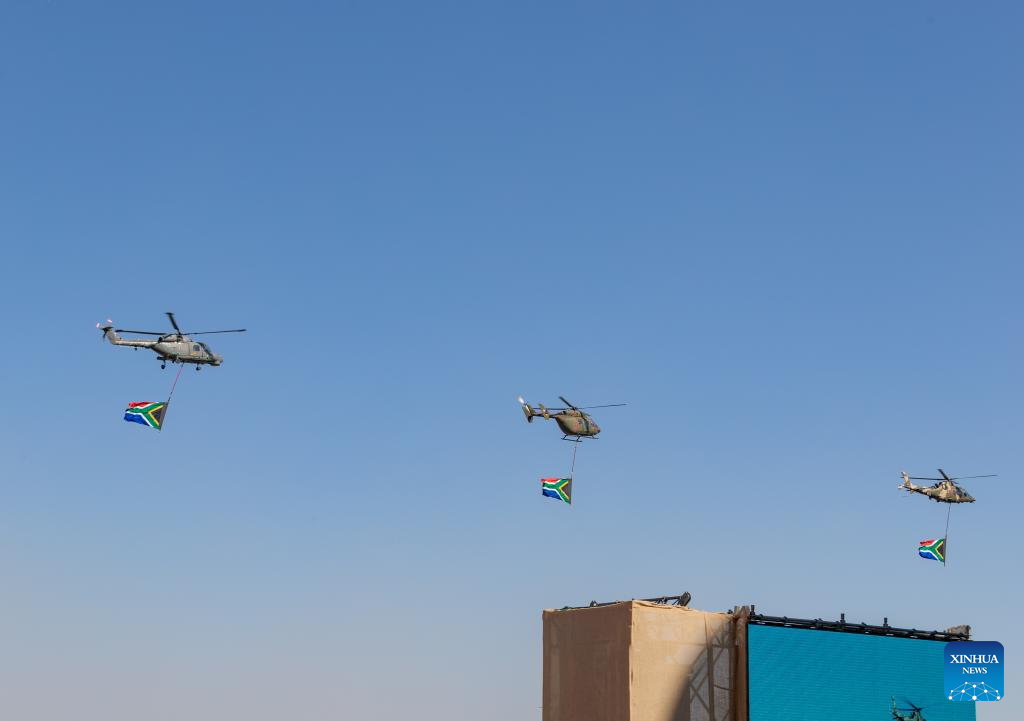 Helicopters fly over the swearing-in ceremony of South African President Cyril Ramaphosa in Pretoria, South Africa, June 19, 2024. Ramaphosa, 71, leader of South Africa's ruling African National Congress (ANC), was reelected as South African president by the National Assembly, the lower house of parliament, on June 14, receiving 283 votes. (Xinhua/Zhang Yudong)