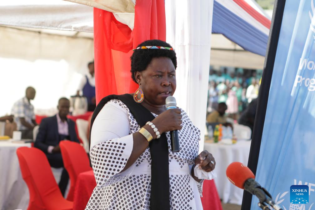 Moriku Kaducu, Uganda's state minister for primary education, speaks during a sports and art gala at Kasemeri Primary School in Moroto, northeastern Uganda, on June 20, 2024. (Photo by Hajarah Nalwadda/Xinhua)