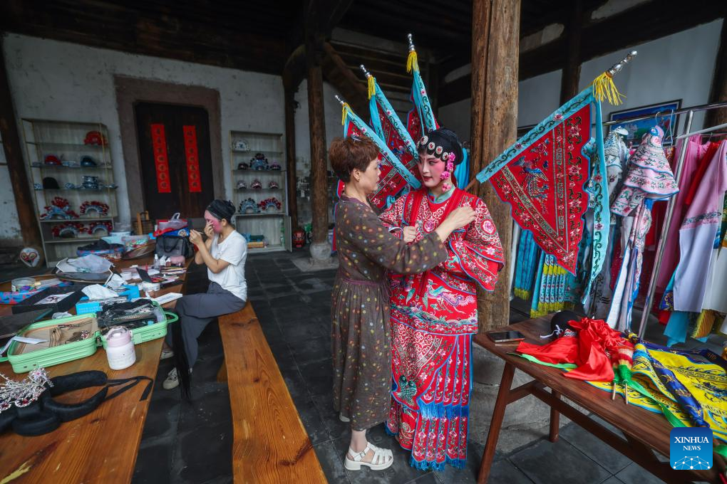 An artist from a local folk troupe of Wu Opera prepares to perform in Zhengdian Village of Lipu Town, Jinhua City, east China's Zhejiang Province on June 25, 2024. (Xinhua/Xu Yu)