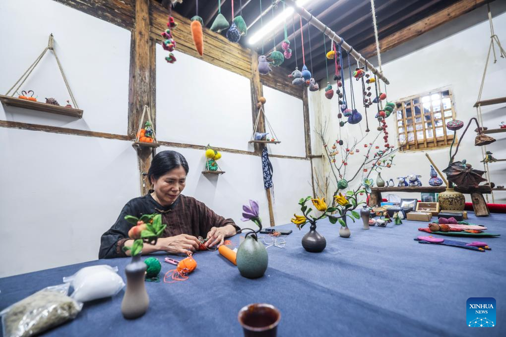 A folk craftswoman showcases handicraft works by local craftsmen at an intangible cultural heritage market in Zhengdian Village of Lipu Town, Jinhua City, east China's Zhejiang Province, on June 25, 2024. (Xinhua/Xu Yu)