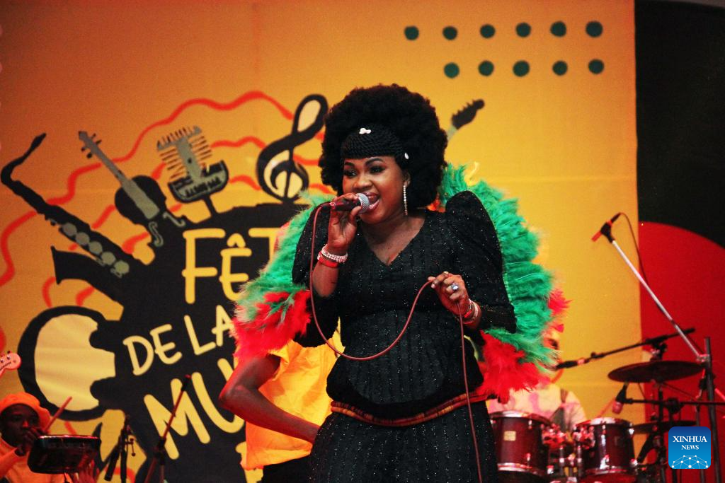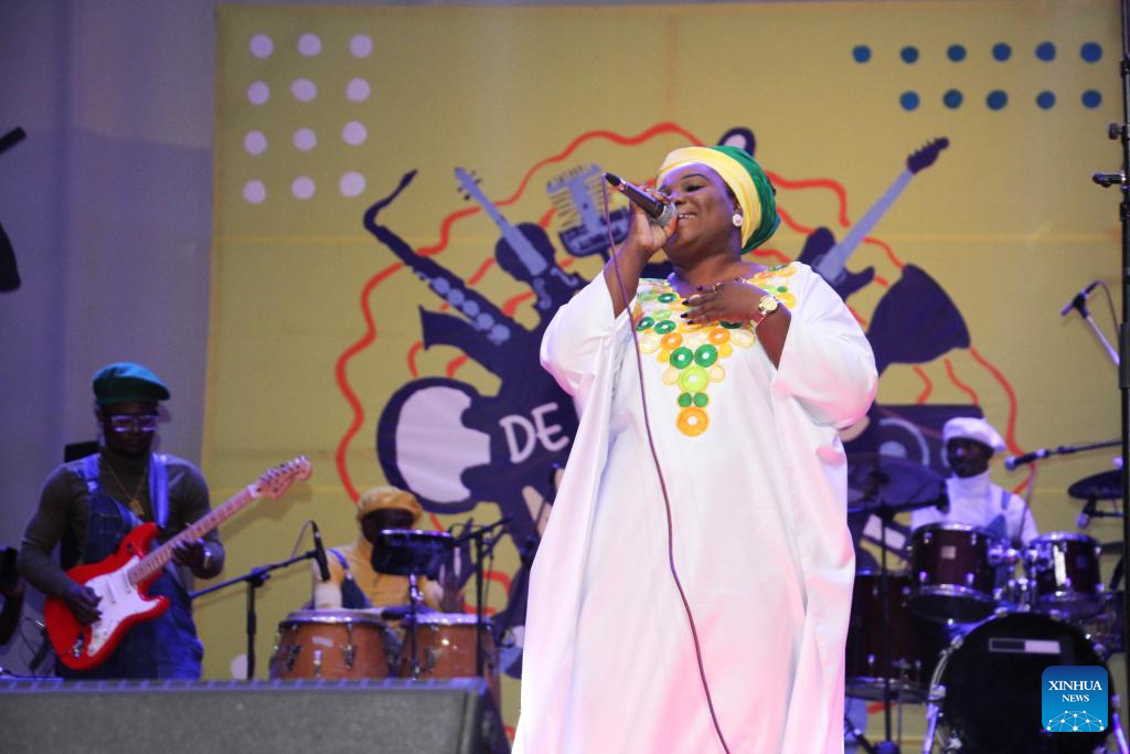 A singer stages a performance at the 2024 edition of the Benin International Music Festival at the Congress Palace in Cotonou, Benin, on June 28, 2024. More than 20 musicians performed their music to the public during the music festival. (Photo by Seraphin Zounyekpe/Xinhua)