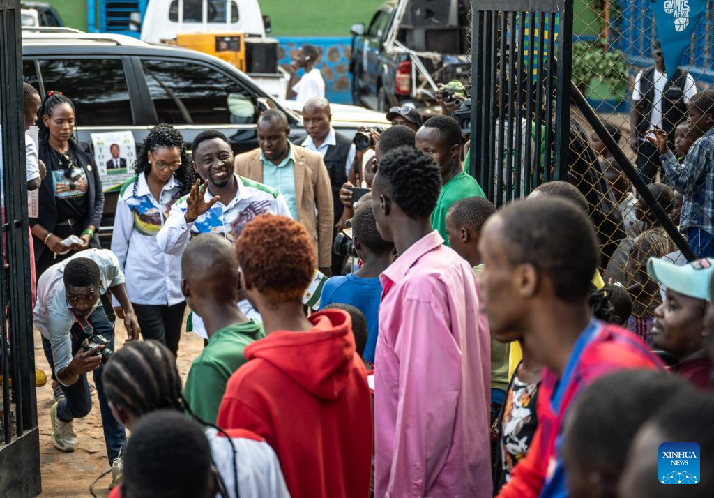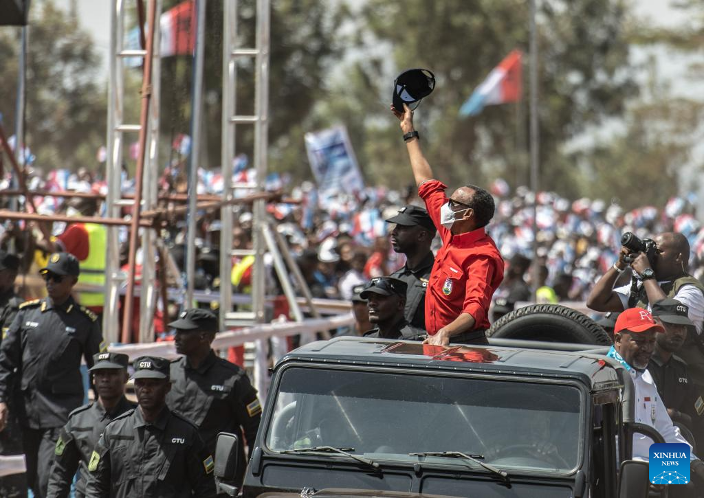 Frank Habineza (4th L, top), candidate from the Democratic Green Party of Rwanda, waves toward supporters at Nyarugenge, Rwanda, July 13, 2024. Rwanda's presidential and parliamentary elections are scheduled for July 14 for Rwandans living abroad, July 15 for those residing in the country, and July 16 for special category representatives. (Xinhua/Wang Guansen)