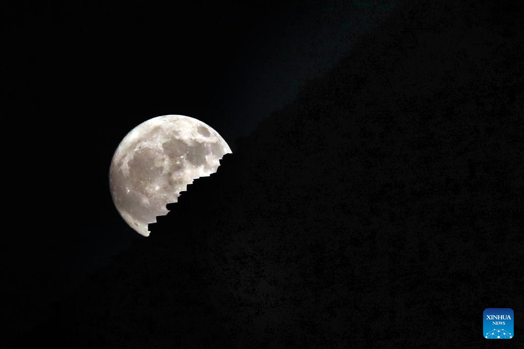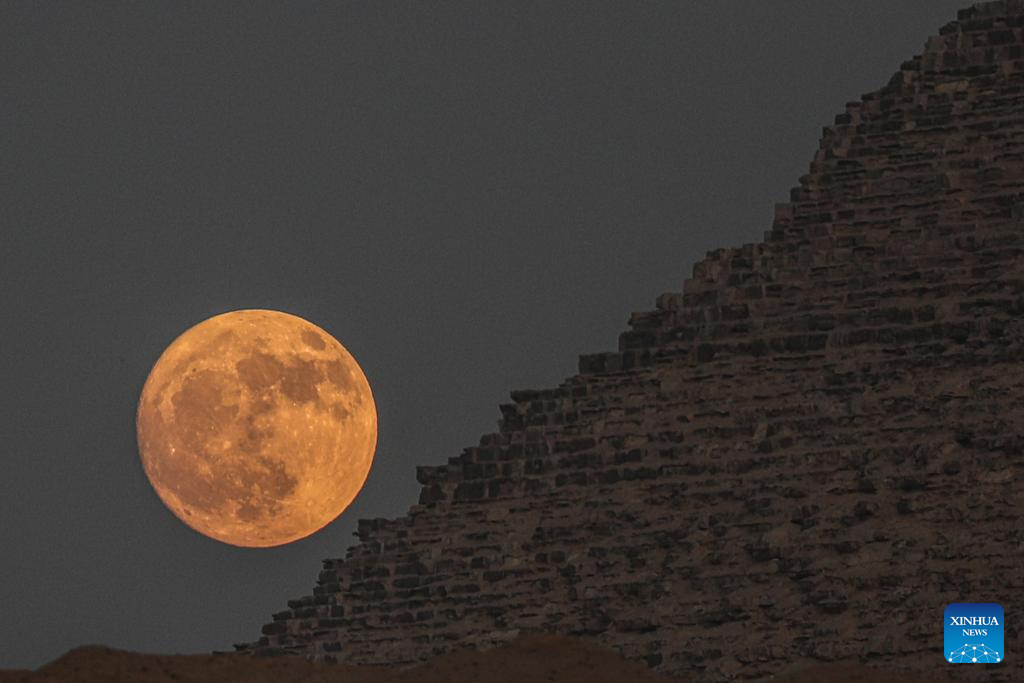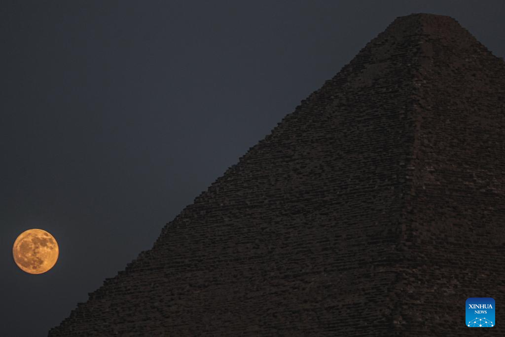 A full moon rises by the Khufu Pyramid in Giza, Egypt, on July 20, 2024. (Xinhua/Ahmed Gomaa)